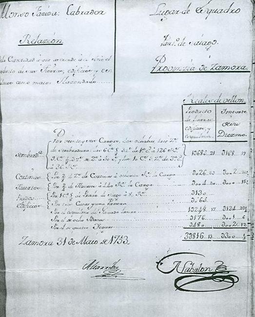 Las denominadas “Respuestas Generales” y “Respuestas Particulares” del “Catastro de Ensenada”, principal fuente informativa del s. XVIII, realizado para reducir los distintos tributos a una sola contribución averiguando los bienes de cada cual, también se pueden consultar en estos archivos. Las primeras como documentación más general, se refieren al tamaño de las localidades, sus límites, las formas y especialización de dichas localidades, la tierra y su aprovechamiento, las medidas de tierra, el valor de los frutos, los gastos del común, los “bienes de propios”[8] y los bienes del común, el aprovechamiento del ganado, el número de vecinos, los trabajos y oficios, la provisión de clérigos y monasterios, las posesiones del rey, etc. En las segundas, cada vecino de un lugar indica su ocupación relacionándose también sus ganados, casas, pajares, etc., y las dimensiones y fincas, ejidos o calles con que limitan.