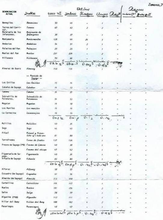 El “Censo de Castilla” (ver figura 2) de 1591, mandado realizar por Felipe II, en el que se describe el número de vecinos pecheros, hidalgos, clérigos y religiosos en cada población y el partido jurisdiccional al que pertenecen.
