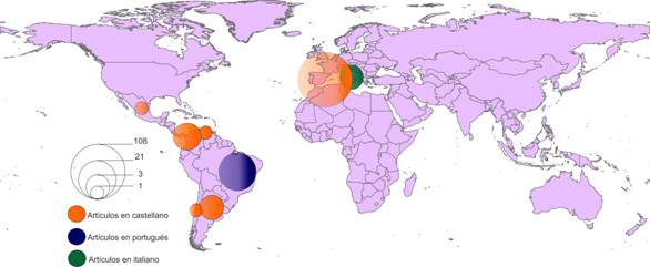 Al hacer un balance de la revista entre los años 1997 y 2010, es posible señalar que esta publicación tiene un alcance internacional y eminentemente iberoamericano (véase la figura 1). Gran proporción de los artículos son firmados por autores adscritos a universidades españolas (108). El resto de la producción se reparte entre Brasil, Colombia, Argentina, México e Italia. En el año 2010 (véase la figura 2) la tendencia es similar, ya que la mayoría de los artículos provienen de universidades españolas, en especial la Universidad de Barcelona, aunque aparecen por primera vez artículos de Chile y Venezuela.