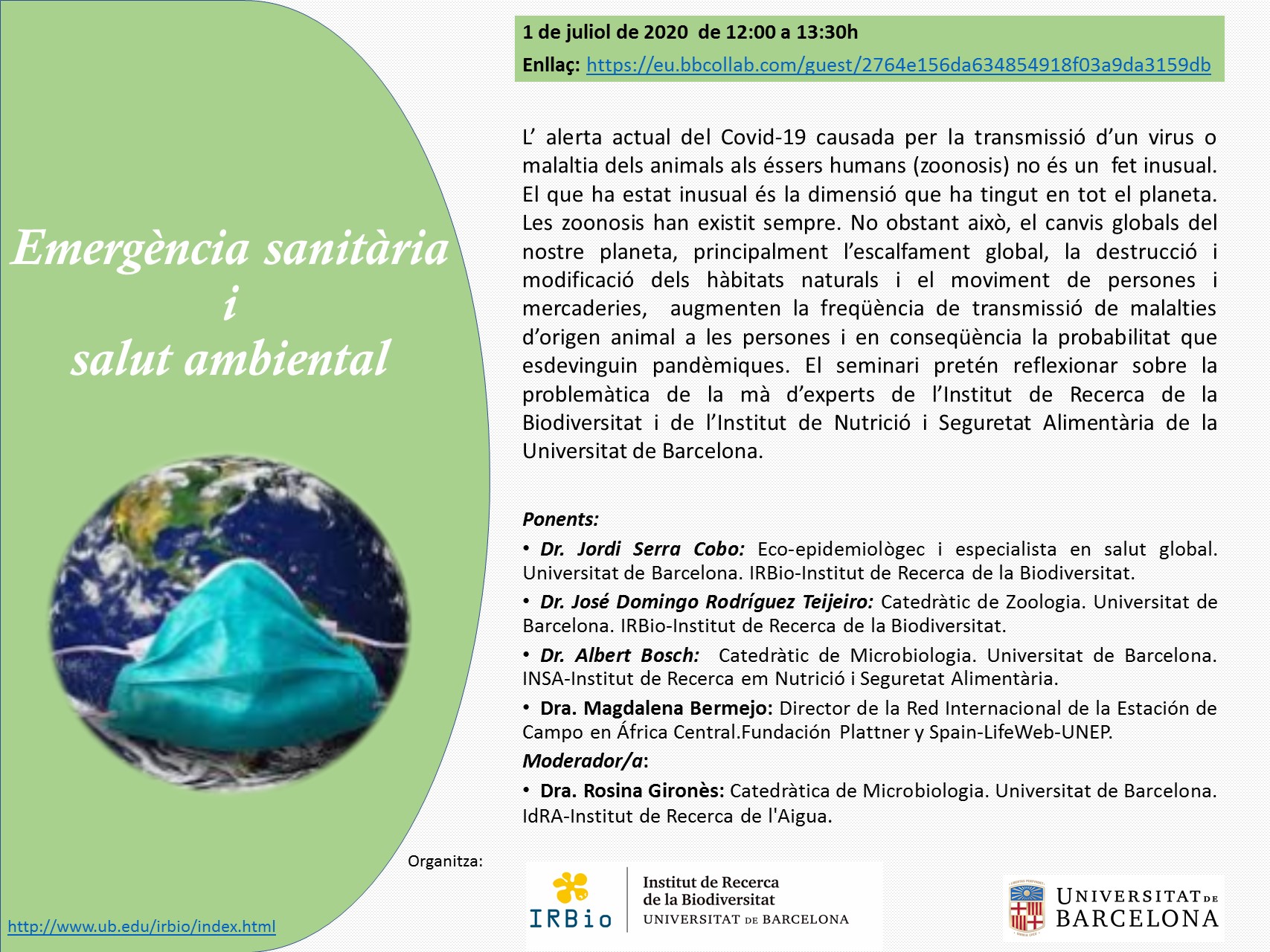 L’ alerta actual del Covid-19 causada per la transmissió d’un virus o malaltia dels animals als éssers humans (zoonosis) no és un fet inusual, el que és inusual és la dimensió que ha tingut en tot el planeta. Les zoonosis han existit sempre. No obstant això, el canvis globals del nostre planeta, principalment l’escalfament global, la destrucció i modificació dels hàbitats naturals i el moviment de persones i mercaderies, augmenten la freqüència de transmissió de malalties d’origen animal a les persones i la probabilitat que esdevinguin pandèmiques. El seminari pretén reflexionar sobre la problemàtica de la mà d’experts de l’Institut de Recerca de la Biodiversitat i de l’Institut de Nutrició i Seguretat Alimentària de la Universitat de Barcelona.