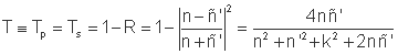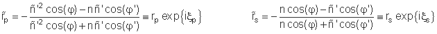 angle que es mostra en el gràfic. En aquest cas: és a dir, els dos coeficients de reflexió tenen mòdul 1 i entre les dues components hi ha només un desfasament 2(β-α)-π (l'angle π fa referència al signe negatiu de rp), amb on Polsant el botó "Polarització" s'activa una nova finestra, en la qual es mostren les el·lipses de polarització de la llum incident, reflectida i transmesa, cadascuna de les quals apareix amb els mateixos colors que els raigs als quals corresponen. L'escala dels eixos va entre 0 i 1, en el cas que aquesta canviï s'indica la posició dels nous valors. Es mostren també les característiques de l'ona incident, que són les que s'han introduït a la finestra "Polarització" i que es poden modificar accedint a la finestra esmentada. En el cas que hi hagi reflexió total, no es pinta l'el·lipse de polarització transmesa (blau), ja que no existeix. A més, es mostren els valors dels angles 2α (angp) i 2β (angs), i també el desfasament total entre les components s i p per la llum reflectida, que serà el que portava la llum incident més (angs-angp-π). Es pot veure com aquest varia amb l'angle d'incidència i els índexs, i com per reflexió total es pot obtenir llum polaritzada el·líptica a partir de llum incident polaritzada linealment. D'altra banda, es pot observar com per un angle d'incidència igual al de Brewster, la llum reflectida està polaritzada linealment en la direcció perpendicular al pla d'incidència. Finestra "Conductors" En aquesta finestra s'estudia la reflexió quan la llum incideix sobre un medi isòtrop de conductivitat no nul·la. En aquest cas l'índex de refracció del segon medi és complex, on n' i k (coeficient d'extinció) són constants reals i positives relacionades amb la constant dielèctrica i la conductivitat del medi. En el programa n' pot variar entre 0.1 i 3.5 i k pot variar entre 0 (cas "Dielèctrics") i 5. Les fórmules de Fresnel anteriors continuen sent vàlides però considerant l'índex de refracció complex pel segon medi. Els coeficients de reflexió, després d'algunes operacions, esdevenen: on totes les quantitats són reals excepte l'índex de refracció del segon medi i el producte i s'ha tingut en compte que la llei de Snell segueix sent vàlida: Aquí φ' té un sentit formal i la seva interpretació no és geomètrica. Com que els coeficients de Fresnel anteriors són complexos, les ones reflectides poden patir canvis de fase (ξp i ξs per la component paral·lela i perpendicular, respectivament), que depenen tant dels índexs de refracció dels dos medis com de l'angle d'incidència. Aquests paràmetres es poden modificar amb les barres de desplaçament. Es mostra també el desfasament total entre les components s i p per la llum reflectida, que és el que portava la llum incident més (ξs-ξp). Cal notar com, en el cas que en la reflexió no s'introdueixi un desfasament addicional entre les dues components, les ones incident i reflectida giren en sentit oposat (si una és dextrogira, l'altra és levogira, i a l'inrevés). Això és només conseqüència del fet que quan descrivim l'estat de polarització d'aquestes ones les estem mirant des de costats oposats (sempre s'ha d'observar l'ona en el sentit en què avança). En el cas d'incidència normal, es recuperen les fórmules que s'han vist pels dielèctrics però amb l'índex de refracció complex, és a dir: El cas de la llum transmesa requereix una anàlisi més exhaustiva. Aquí només s'estudia el cas d'incidència normal, per al qual el factor de transmissió T, definit com el quocient entre l'energia per unitat d'àrea transmesa respecte a la incident, resulta: (R és el factor de reflexió). L'ona transmesa es pot escriure com una ona plana que es propaga en el medi conductor en la direcció z (perpendicular a la superfície de separació) i amb un índex de refracció complex. El seu camp elèctric es pot escriure com: Això correspon a una ona plana propagant-se en un medi d'índex n' però amb una amplitud que decau exponencialment amb la distància recorreguda dins del medi (s'ha considerat que z=0 correspon a la superfície de separació). Aquesta dependència es mostra en un gràfic, i també la distància que ha de recórrer l'ona dins del medi conductor per tal que la seva amplitud decaigui en un factor 1/e, que es coneix amb el nom de profunditat de penetració (zp) i caracteritza el medi: λ és la longitud d'ona de la llum i també es pot canviar amb una barra de desplaçament. |