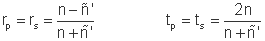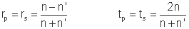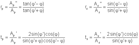 Polarització de la llum i lleis de Fresnel En aquesta aplicació s'estudia la polarització de la llum i la seva reflexió i refracció en medis isòtrops. La primera finestra mostra com aconseguir els diferents estats de polarització de la llum a partir de la superposició de dues ones planes amb certes característiques. Les finestres segona i tercera permeten veure el comportament de les ones reflectida i transmesa depenent de les propietats d'una ona incident sobre la superfície de separació de dos medis. El segon medi pot ser dielèctric o conductor. S'estudia tant la relació d'amplituds (coeficients de Fresnel) com la variació de l'el·lipse de polarització. Finestra "Polarització" En aquesta finestra s'estudia la superposició de dues ones planes amb els seus vectors elèctrics perpendiculars, que viatgen en la mateixa direcció, tenen la mateixa freqüència, i amplituds diferents i desfasades entre si. Les barres de desplaçament permeten modificar les amplituds de les ones p (Ap) i s (As) i el desfasament δ entre elles. El gràfic situat a la part inferior representa les dues ones. Els camps elèctrics Ep i Es associats poden expressar-se com: El camp elèctric resultant genera, quan es propaga, una espiral de pas el·líptic, que es representa en el gràfic superior esquerre. També s'indiquen les característiques de l'el·lipse de polarització: les longituds dels semieixos major i menor, i l'angle de l'el·lipse respecte de l'eix p. També s'indica el vector de Stokes S que descriu l'estat de polarització de la llum. Els paràmetres de Stokes es calculen segons: El signe del paràmetre S indica si la llum és dextrogira (S>0), és a dir, gira en el sentit de las agulles del rellotge, o levogira (S<0), quan gira en sentit antihorari. Això es mostra dins del requadre negre de l'el·lipse posant una D o una L, respectivament. Finestra "Dielèctrics" En aquesta finestra s'estudia la reflexió i refracció de la llum en medis dielèctrics isòtrops, tenint en compte les fórmules de Fresnel, que especifiquen els valors que pren l'amplitud del camp quan aquest canvia de medi o es reflecteix, en funció de l'amplitud incident. Se suposa a més que els medis no són absorbents per les longituds d'ona amb què es treballa. Si una ona incideix sobre una superfície que separa dos medis d'índexs de refracció n i n' amb un angle φ (respecte a la normal a la superfície), aquesta es reflecteix amb un angle de reflexió igual a l'incident i es transmet al segon medi amb un angle refractat φ' que ve donat per la llei de Snell: Les barres de desplaçament permeten modificar els índexs de refracció dels dos medis i l'angle d'incidència. L'aplicació calcula l'angle de refracció i mostra els raigs incident (vermell), reflectit (verd) i refractat (blau). També calcula els coeficients de Fresnel, que són els quocients de les amplituds reflectida (A') o refractada (A') respecte a la incident (A): Els subíndexs p i s fan referència al camp que vibra paral·lelament (p) o perpendicular (s) al pla d'incidència. Aquest ve determinat pel raig incident i la normal a la superfície (en el dibuix correspon al pla de la pròpia pantalla). La component p es representa per un vector amb diferents orientacions dins d'aquest pla mentre que la component s es representa amb un vector que apunta cap a fora o cap a dins del pla de la pantalla. En el cas d'incidència normal, les fórmules esdevenen: Quan es polsa el botó "Coeficients de Fresnel" (opció activada per defecte en entrar al programa), es mostra amb diferents colors la variació dels coeficients de Fresnel amb l'angle d'incidència. Un punt groc superposat al gràfic indica l'angle d'incidència seleccionat. Hi ha alguns casos d'interès especial: