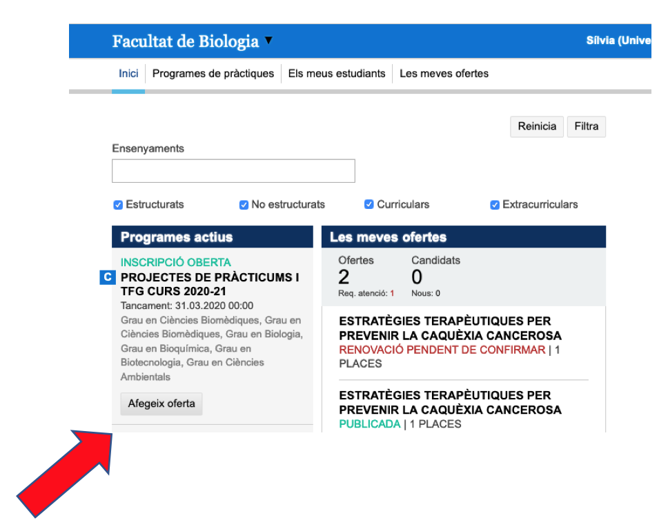 Si voleu oferir un altre projecte nou, heu de clicar "AFEGEIX OFERTA" i seguir les intruccions en aquest enllaç: http://www.ub.edu/practicumbiologia/content/oferta-nova