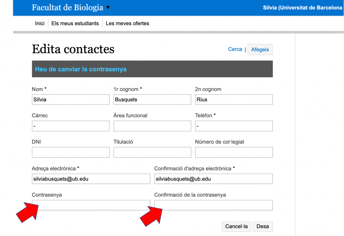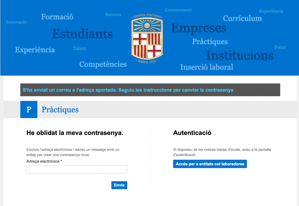 En cas que aparegui el missatge de què no hi ha cap usuari amb la vostra adreça, cal que us poseu en contacte amb convenis.bio@ub.edu, posant en còpia a RRHH de la vostra entitat o el vostre gestor de pràctiques.
