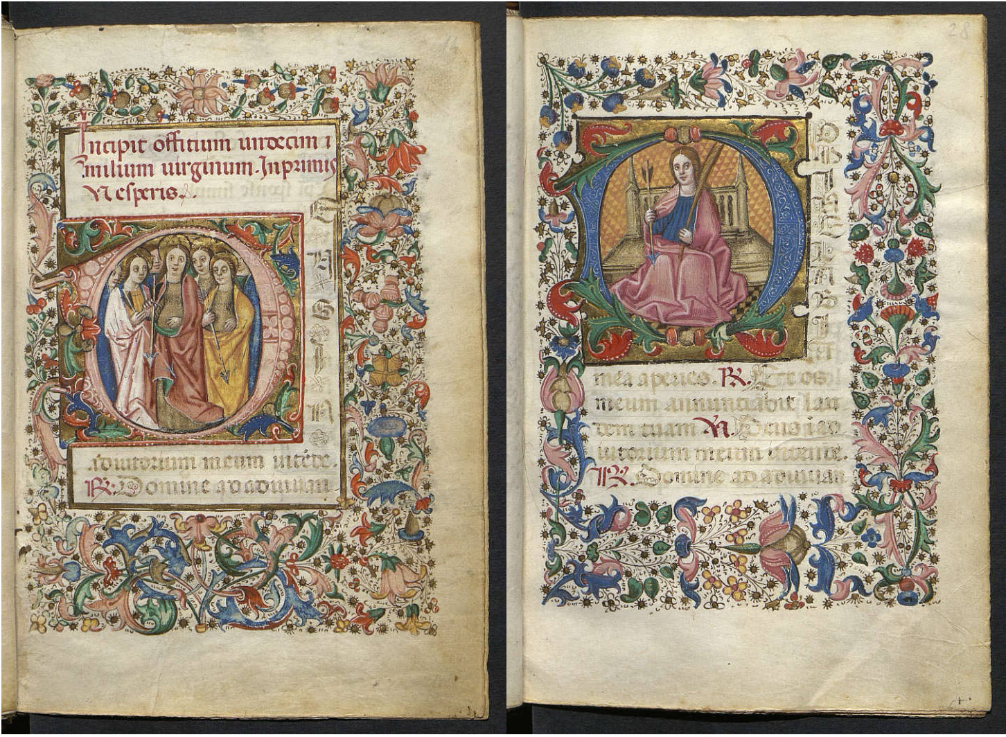 La yuxtaposición de texto e imagen conformaba un todo narrativo para la lectio divina, que funcionaba a través de fórmulas y técnicas pictórico-narrativas reconocibles por el lector a través de iniciales historiadas (Ringbom, S. 1995. págs. 46-47): el Oficio de las Once Mil Vírgenes se identifica por estar enmarcado entre dos iluminaciones (f.14 y f. 28), de la misma manera que destacan dos ciclos pictóricos casi análogos de los gozos de la Virgen (f.148-151v y 156v-163) con seis iluminaciones respectivamente. La imagen del rey David señala el comienzo de los siete Salmos penitenciales (fol. 184), como sucede con una escenificación para el Oficio de la Misa de los Difuntos (fol. 209), y una imagen de la Transfiguración para el Oficio de la Misa (fol. 303). Por consiguiente, los dos ciclos pictóricos de los gozos de la Virgen devinieron los más iluminados, destacando del resto de las oraciones y ganando centralidad. Asimismo, los ornamentos y rúbricas muestran indicios de haber sido diseñados igualmente para su uso, facilitando la identificación de cada rezo, indicando cómo llevar a cabo la lectio (Varela-Rodríguez, M. 2016. págs. 62-64).