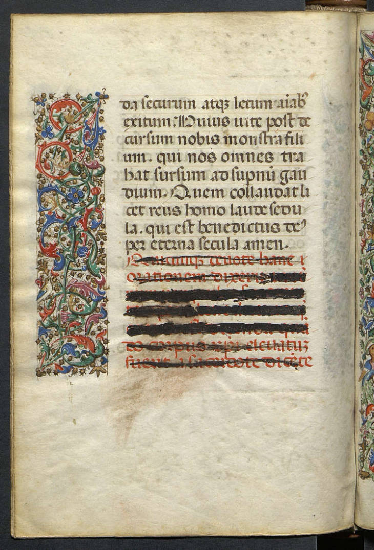 Por un lado, unas líneas borradas (fol.150) en el fragmento correspondiente a la Oraciones por la Elevación del Cuerpo y Sangre de Cristo en la Santa Misa (fols.175v-178v), nos vienen a confirmar el uso del libro (Imagen 4). Sin embargo, es complicado concretar cómo, y cuántas veces fue utilizado: unas oraciones que habrían sido destacadas en rojo por el copista fueron tachadas por una mano posterior. El tachado consistió seguramente en la censura de la mano de un intelecto, conocedor de los debates en torno a la transubstanciación y la Eucaristía. Y es que una parte de lo censurado es legible todavía, por lo que podemos acercarnos a la temática que se intentó censurar: “Quiqumque devote hanc orationem dixerit […] corpus xristi elevatur fuerit a sacerdote dicente missam.” (Fernández Lahosa, M. 2013. págs.21-22) Aunque el borrado no pueda ser fechado, nos sugiere algo más sobre la utilización del libro, poniendo distancia entre un posible primer poseedor directo, y otro posterior de lectura intelectual, como podría ser el bibliotecario carmelita de Sant Josep, que actuó como una autoridad eclesiástica censurando un pequeño apartado. La capacidad intelectual que refleja el tachado de temática teológica nos ayuda a entender que las imágenes del libro de horas no respondían a la necesidad de un público analfabeto, y que tampoco fueron un simple objeto estético: las imágenes iluminaban, daban luz al texto, como evidenció M. Elisa Varela- Rodríguez (Varela-Rodríguez, M. 2016. pág. 63).