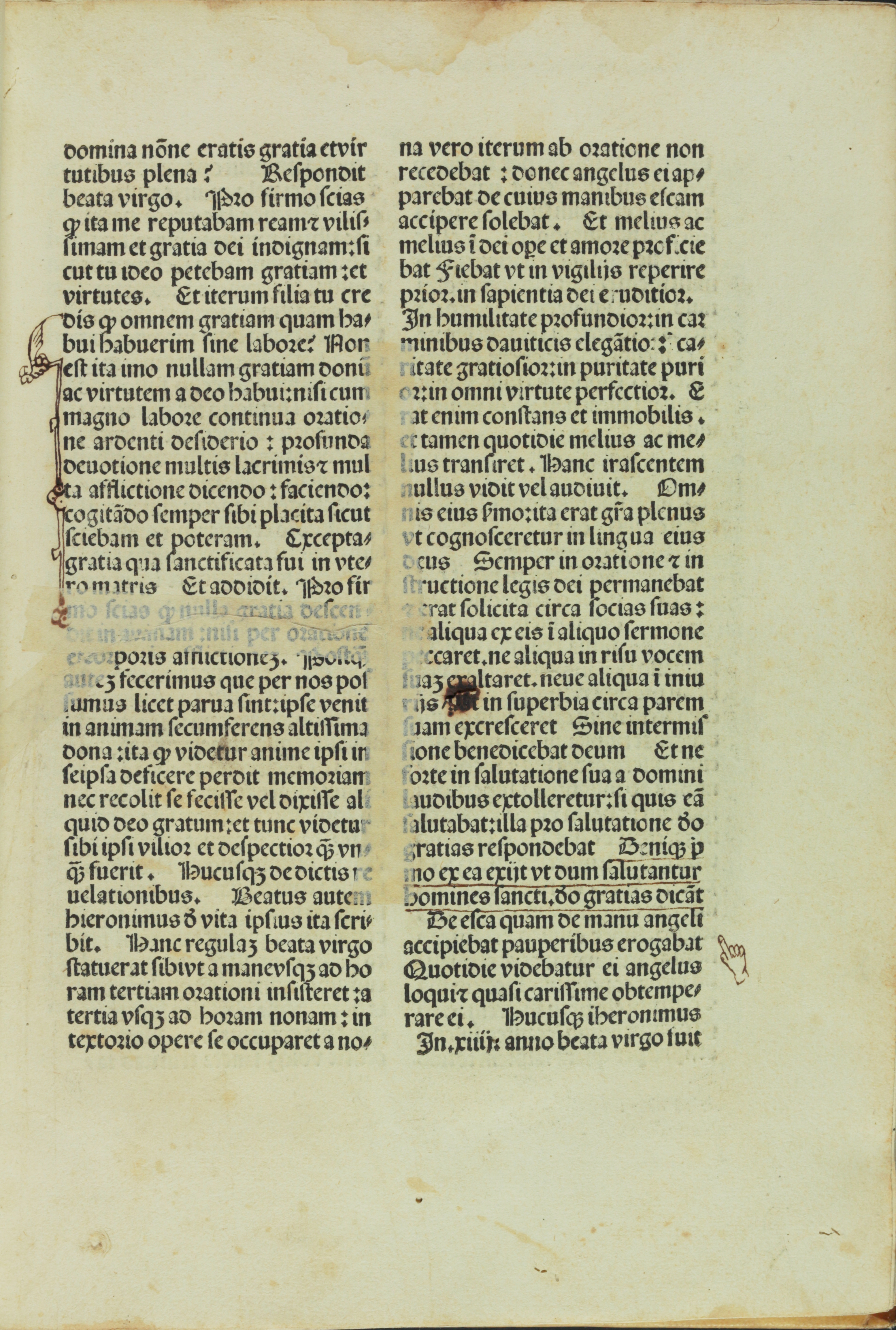 Las manículas y los subrayados dan igualmente algunas indicaciones del uso del incunable. Un subrayado orlado (cf. Fig. 3), que se encuentra además en una página muy desgastada por el uso, destaca el fragmento que se refiere al descenso de la gracia mediante la oración y la mortificación (cap. IIII: Filia: tu credis quod omnem gratiam...) y una manícula (cf. Fig. 4) destaca el pasaje en que se señala la importancia de la paciencia frente a la adversidad (cap. XII De fuga Domini in AEgyptum). Otras dos manículas destacan pasajes del capítulo XLV (De vita activa et contemplativa...) en que se enfatiza la importancia de purificar el alma mediante las prácticas contemplativas centradas en la humanidad de Cristo.