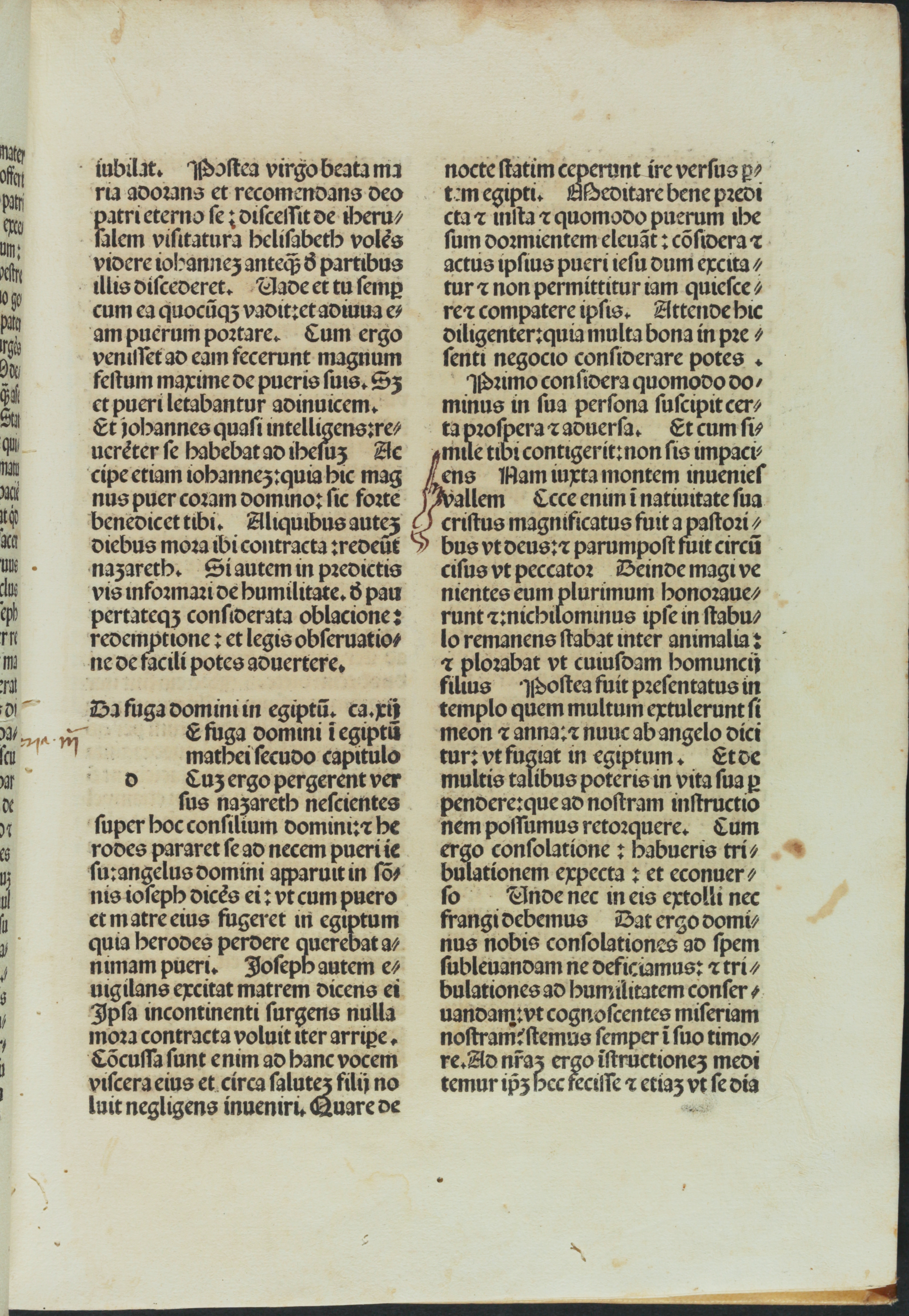 Por lo demás, el incunable que nos ocupa contiene varios subrayados, manículas y anotaciones manuscritas que permiten llegar a la conclusión de que, con toda probabilidad, este ejemplar se utilizó para la meditación semanal en los términos en que se aconseja en el capítulo LXXXXVII. El propio índice inicial (cf. Fig. 1) contiene varias anotaciones manuscritas que corresponden a la segmentación temporal recomendada. Las anotaciones manuscritas se repiten en el cuerpo del texto al inicio de segmentaciones como el capítulo correspondiente a la huida a Egipto (cap. XII), el discurso de Jesús en la Sinagoga (cap. XVII), el ministerio de Marta y María (cap. XLIIII) o la meditación del sábado (cap. LXX); es decir, se han destacado las partes correspondientes al lunes, martes, miércoles y sábado. Dado que las anotaciones manuscritas en los márgenes son completamente redundantes respecto al contenido del propio texto impreso (p. ej. la anotación "meditatio sabati" aparece a la altura del título "Me die sabbati", cf. Fig. 2), cabe pensar que no debían de tener más objeto que el de localizar más rápidamente los pasajes en cuestión y demostrarían, pues, una utilización reiterada del ejemplar.