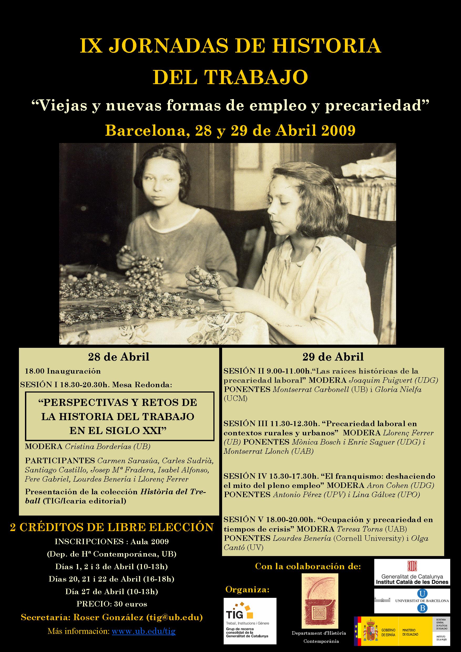 El Grup de Recerca consolidat de la Generalitat de Catalunya Treball, Institucions i Gènere (TIG) organitza unes Jornades anuals sobre Història del Treball que tenen l'objectiu de millorar la coordinació entre les investigacions en curs, estimular els debats entre especialistes, i contribuir al desenvolupament de la perspectiva de gènere en els estudis històrics sobre el treball. En aquesta novena edició proposem una reflexió en la llarga durada a l'entorn de la precarietat en l'ocupació.