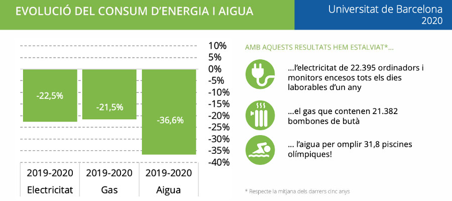 Desde el año 2015, el OSSMA genera informaciones sobre la evolución de los consumos de los edificios de la UB, y prepara infografías específicas para que cada facultad pueda difundir los resultados entre su comunidad universitaria.