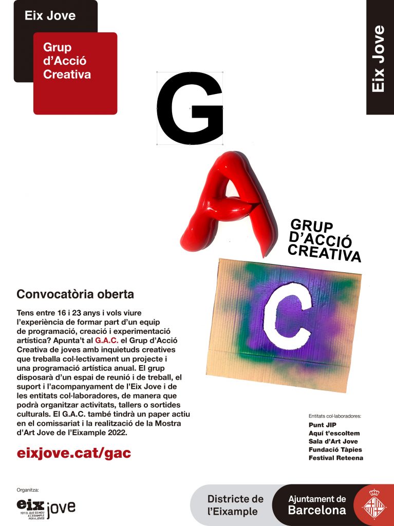 El Grup d’Acció Creativa és un equip plural de joves amb inquietuds creatives que treballa col·lectivament i de forma assembleària un projecte i una programació artística anual. Les persones participants del grup disposaran d’un dia de reunió setmanal, un espai de treball, suport i acompanyament. Així mateix, podrà gaudir d’un programa d’activitats en col·laboració amb els principals espais artístics del Districte de l’Eixample. Aquesta iniciativa està encarada a joves de 16 a 23 anys que vulguin formar part d’un espai cultural i artístic més enllà de la formació acadèmica.