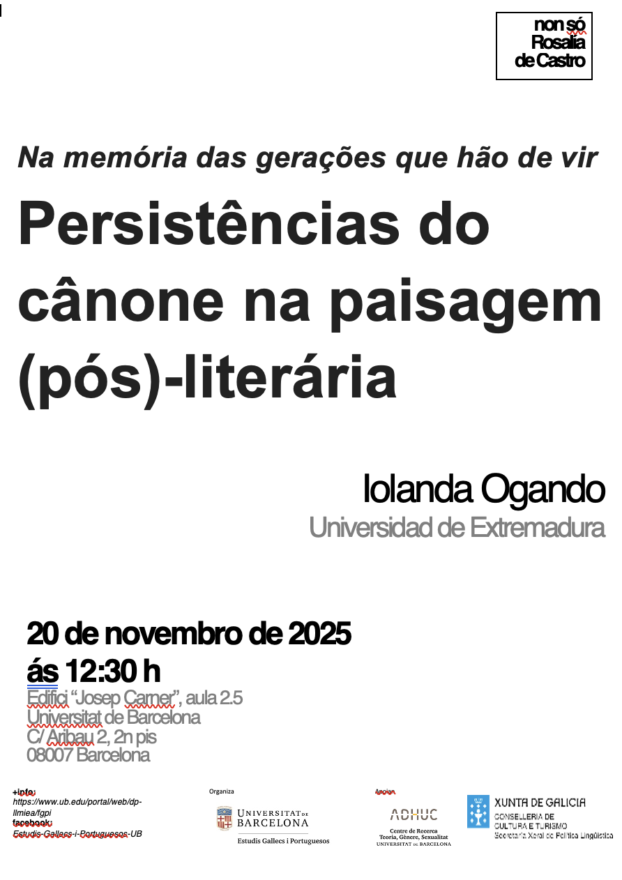 This event is part of the series 'Non só Rosalía de Castro', organised by Galician and Portuguese Studies and ADHUC-Center for Research in Theory, Gender and Sexuality. Presentation in Portuguese.