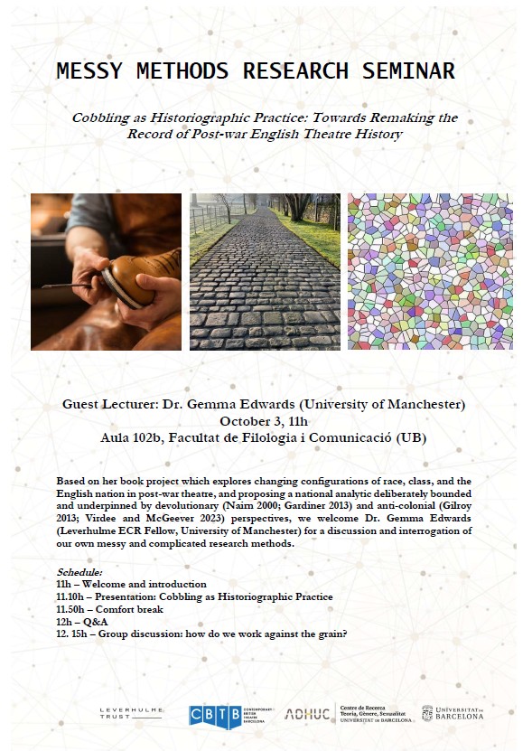 Based on her book project, which analyzes the shifting configurations of race, class, and nation in post-war British theatre—and proposes a deliberately bounded national analysis grounded in devolved (Nairn 2000; Gardiner 2013) and anticolonial perspectives (Gilroy 2013; Virdee & McGeever 2023)—Gemma Edwards (Leverhulme ECR Fellow, University of Manchester) invites us to a session of reflection and debate around our own research methods, often complex and messy.