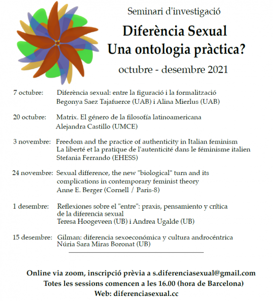 The research seminar “Diferència sexual - una ontologia pràctica?”, which will take place twice a month between October and December 2021, has the purpose of focusing on the topic of sexual difference, with its richness and its constitutive openness. Each session of the seminar will be organized around a presentation in which one of the multiple perspectives on sexual difference will be explored. These presentations will be followed by a time for comments, questions and a debate. Organized by three predoctoral researchers - Teresa Hoogeveen (ADHUC—Universitat de Barcelona), Alina Mierlus (Universitat Autònoma de Barcelona) i Andrea Ugalde (Universitat de Barcelona) -, the seminar is grounded on the intuition that questioning sexual difference is still a fundamental key of intelligibility in the process of tackling some categories of our occidental tradition. Hence the seminar offers, among other options, to turn sexual difference into a praxis or to considerate its relationship with ontological difference.