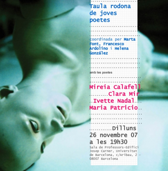 El próximo lunes 26 de noviembre se celebrará una mesa redonda de poetas noveles bajo el título "Hijas somos de barro informe". Moderada por Marta Font, intervienen en ella Mireia Calafell, autora del poemario Poètiques del cos y ganadora del premio Amadeu Oller 2006, Clara Mir, Ivette Nadal y Maria Patricio. A partir de los versos de Mercè Rodoreda que dan título al acto, las poetas leerán una breve autopoética y algunos de sus poemas, que comentarán con el público. Ivette Nadal acompañará su recital con guitarra acústica.