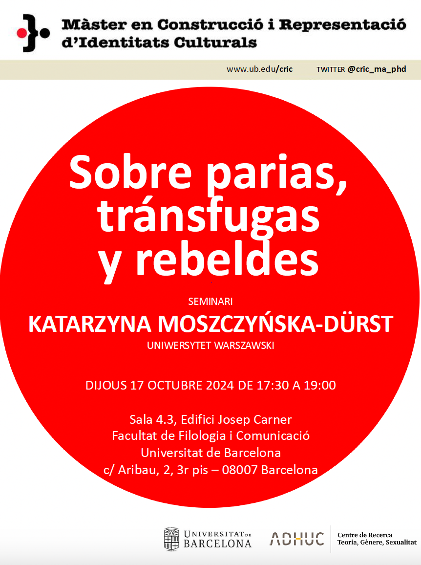 Katarzyna Moszczyńska-Dürst (GENIA-Uniwersytet Warszawski) ofrece el seminario "Sobre parias, tránsfugas y rebeldes", en el que hará una aproximación teórica a estas figuras de exclusión y su productividad en los estudios de género y sexualidad, así como en el análisis de la literatura argentina contemporánea.
