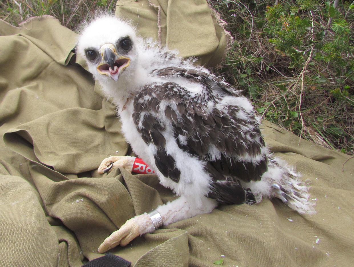 The Conservation Biology Group, in collaboration with researchers from the University of Exeter (United Kingdom), has published a new study in the scientific journal IBIS where the diet of Bonelli’s Eagle cheeks is analysed by conventional diet methods such as pellet analysis and by stable isotope analyses of chick feathers. Stable isotopes are non-radioactive atoms of a specific chemical element that have the same number of protons but differ in the number of neutrons. For instance, the most common carbon has an atomic weight of 12, with 6 protons and 6 neutrons (12C), but there are also stable carbon atoms with 6 protons and 7 neutrons (13C). Several studies in Ecology have shown that the proportion of certain stable isotope in a predator reflects its diet, as this proportion is transmitted from one level to another in the food chain in a predictable manner. In a previous study conducted by our research group this property was already used to have a first look at the diet of chicks by the analysis of stable isotopes of carbon, nitrogen and sulfur.