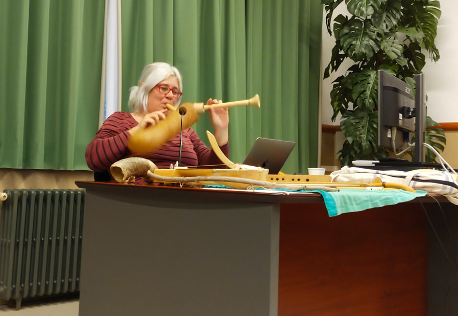 After the lunch break, the presentations dealt with the topic of ‘Musical instruments’. Simon Wyatt, an independent researcher from Edinburgh, offered a remote presentation entitled ‘Archoustemology and the Aurignacian’, which explored the acoustic nature of the Upper Palaeolithic aerophones from multiple perspectives with the aim of combining cultural, ritual, ecological, psychological and musical aspects of the past. After this presentation, Raquel Jiménez Pasalodos (University of Valladolid) talked about ‘The materiality of the immaterial: A theoretical approach to the study of archaeological musical instruments”’. She discussed a series of music archaeological methodologies applied to the study of sound-producing artefacts. These objects, she argued, reveal key aspects of disappeared musical cultures, including cultural practices, acoustic knowledge, performative techniques, cultural connections and music theories.