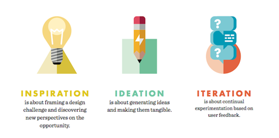 Inspira't: Sortir de les roderes del pensament analític és l'essència del design thinking; per aconseguir la inspiració parleu amb la comunitat, submergiu-vos en les perspectives i experiències d'altres persones, visiteu nous llocs i mireu les coses amb ulls nous.