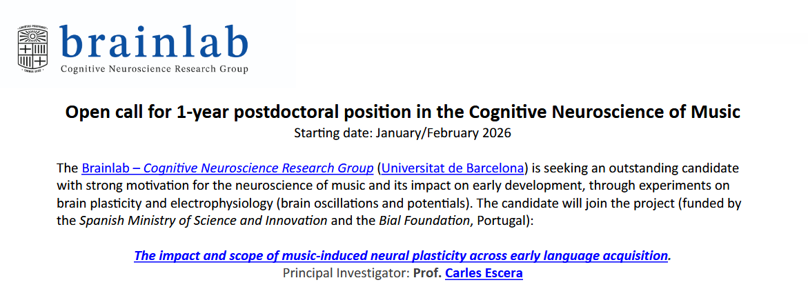 The Brainlab – Cognitive Neuroscience Research Group (Universitat de Barcelona) is seeking an outstanding candidate with strong motivation for the neuroscience of music and its impact on early development, through experiments on brain plasticity and electrophysiology (brain oscillations and potentials). The candidate will join the project (funded by the Spanish Ministry of Science and Innovation and the Bial Foundation, Portugal):