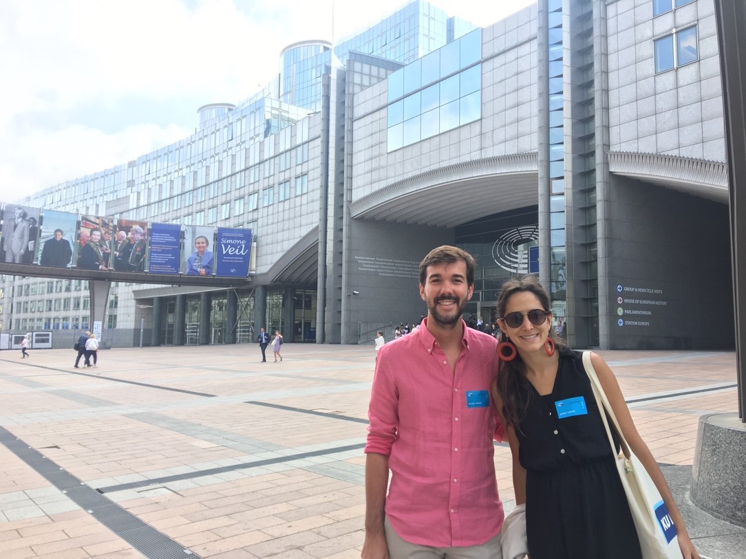 Oriol Comas y Ana M. Greco, representantes de la UB a la LERU Doctoral Summer School 2018, durante la visita a la sede del Parlamento Europeo en Bruselas.