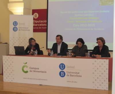 El pasado viernes 30 de noviembre de 2012 se reunió por primera vez todo el profesorado que imparte docencia (teórica y práctica) en los grados de Nutrición Humana y Dietética (NHD) y de Ciencia y Tecnología de los Alimentos (CTA) en la Sala de Les Voltes del Edificio de la Administración del Campus de la Alimentación de Torribera.