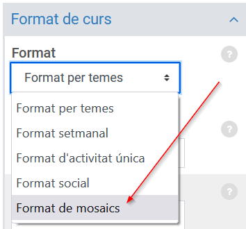 Per activar-ho, només cal que aneu a Edita paràmetres (tot fent clic a la icona d'engranatge situada a la cantonada superior dreta de la pàgina del curs). A continuació, a l'apartat Format de curs<Format, seleccioneu Format de mosaics: