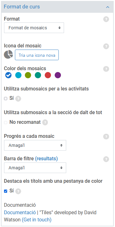- Color dels mosaics: el color que s'estableixi aquí s'aplicarà a tots els mosaics del curs.