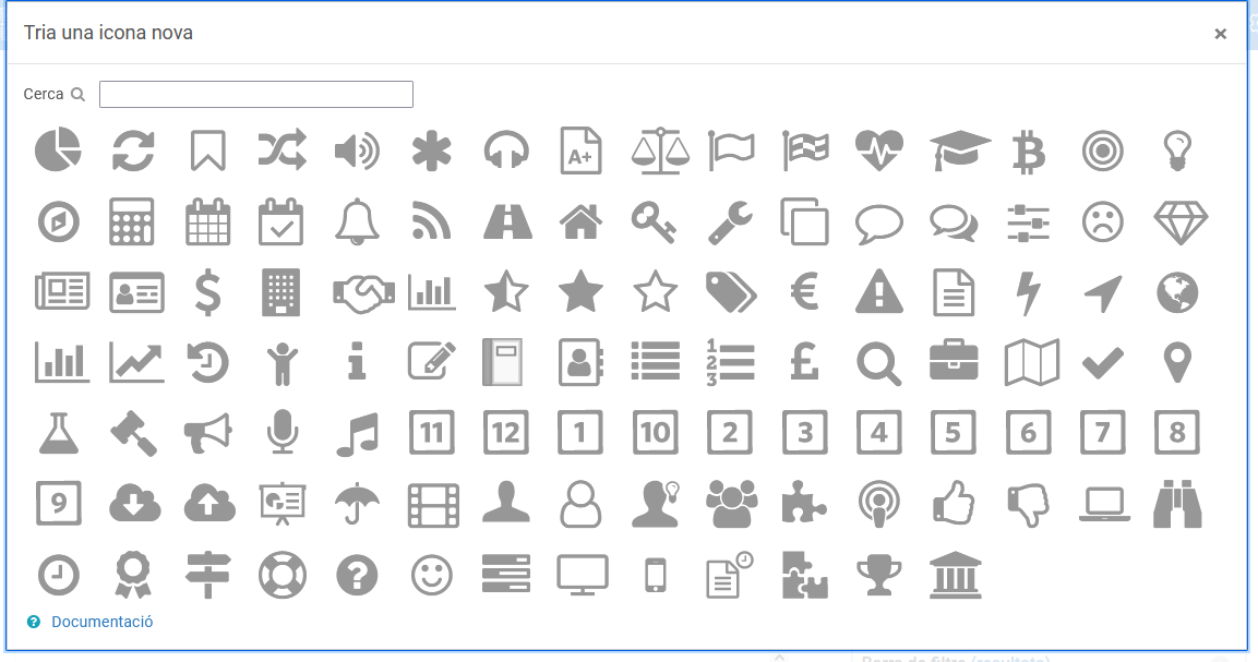 - Icona del mosaic: la icona seleccionada aquí apareixerà a tots els mosaics del curs per defecte. Es pot seleccionar una icona diferent pels mosaics individuals, mitjançant una configuració diferent dins del mosaic.