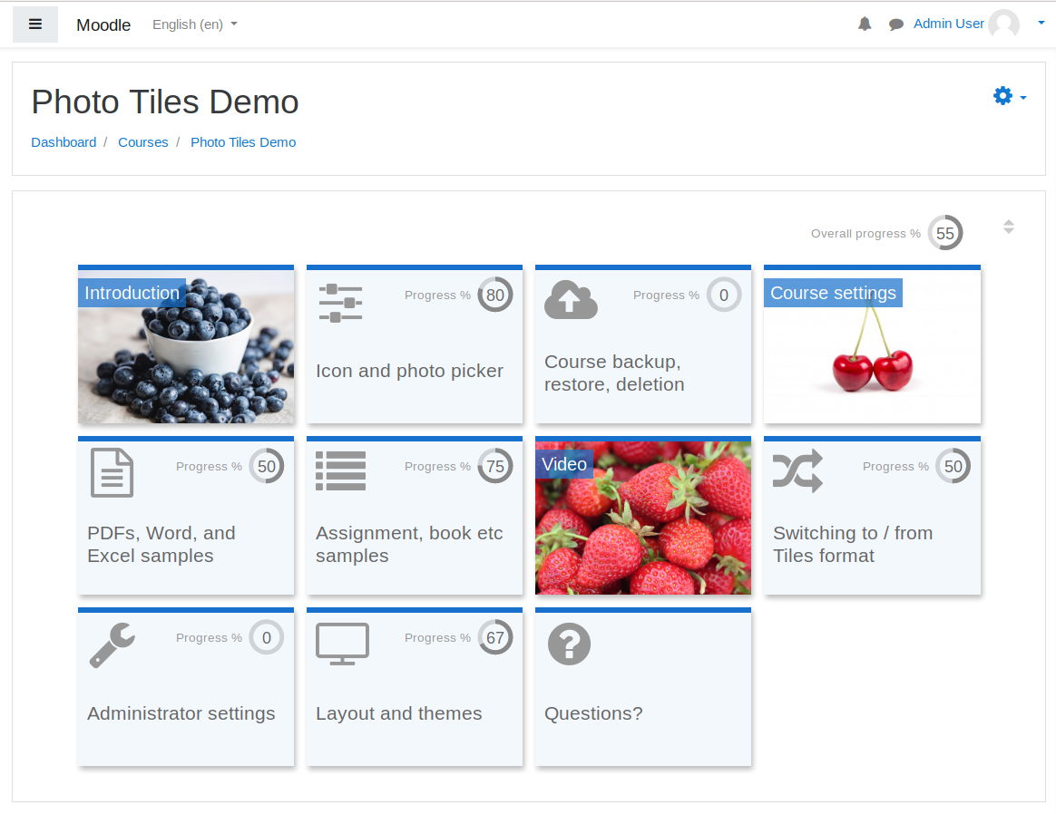- Submosaics per a les activitats: cada activitat es mostra com un submosaic dins de cada mosaic, en llos de mostrar-se com una llista d'activitats a la pàgina. Això no s'aplica a les etiquetes, que no es mostraran com a submosaics, de manera que es poden utilitzar com a títols entre mosaics.