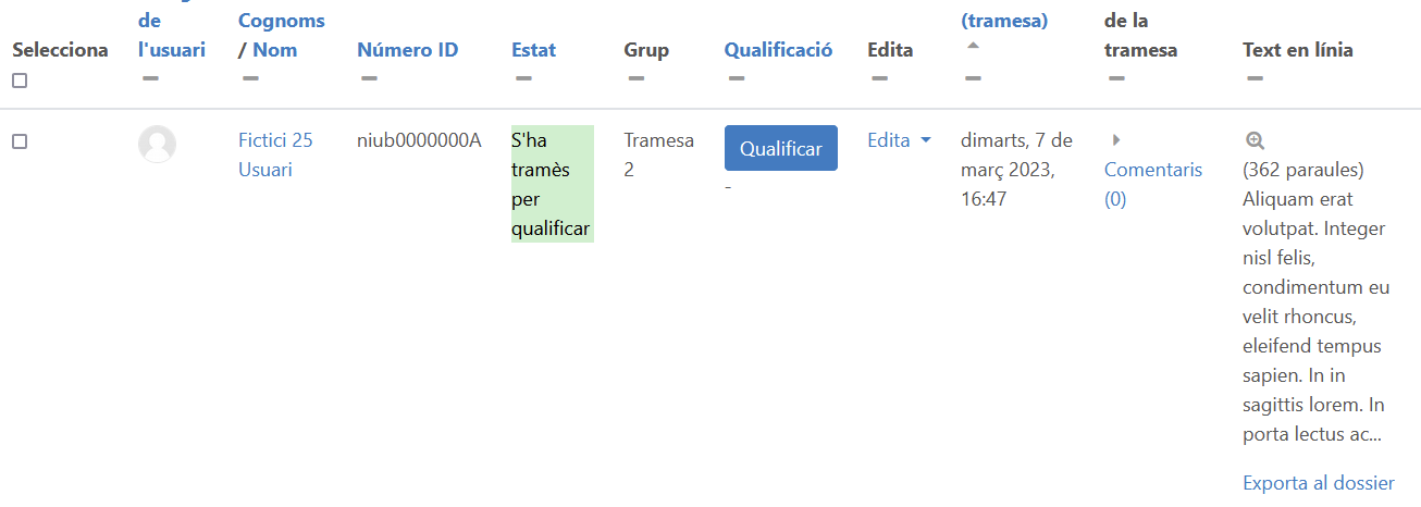 Com a professor, un cop els estudiants hagin pujat els fitxers, si entrem a l’apartat Visualitza/Qualifica totes les trameses