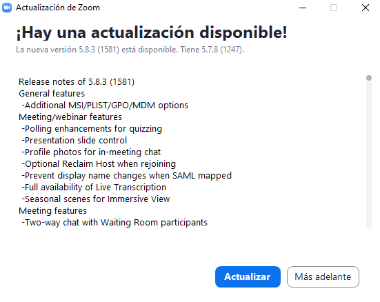 Si teniu instal·lat el client de Zoom us recomanem que l'actualitzeu a l'última versió. Incibe ha publicat la notícia on trobareu tota la informació: https://www.incibe.es/protege-tu-empresa/avisos-seguridad/si-usas-zoom-tus-videoconferencias-actualiza.