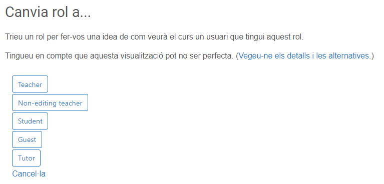 El Campus Virtual permet canviar el nostre rol (de professor a altres rols, com ara alumne, o professor no editor), per fer proves de visualització al nostre curs.