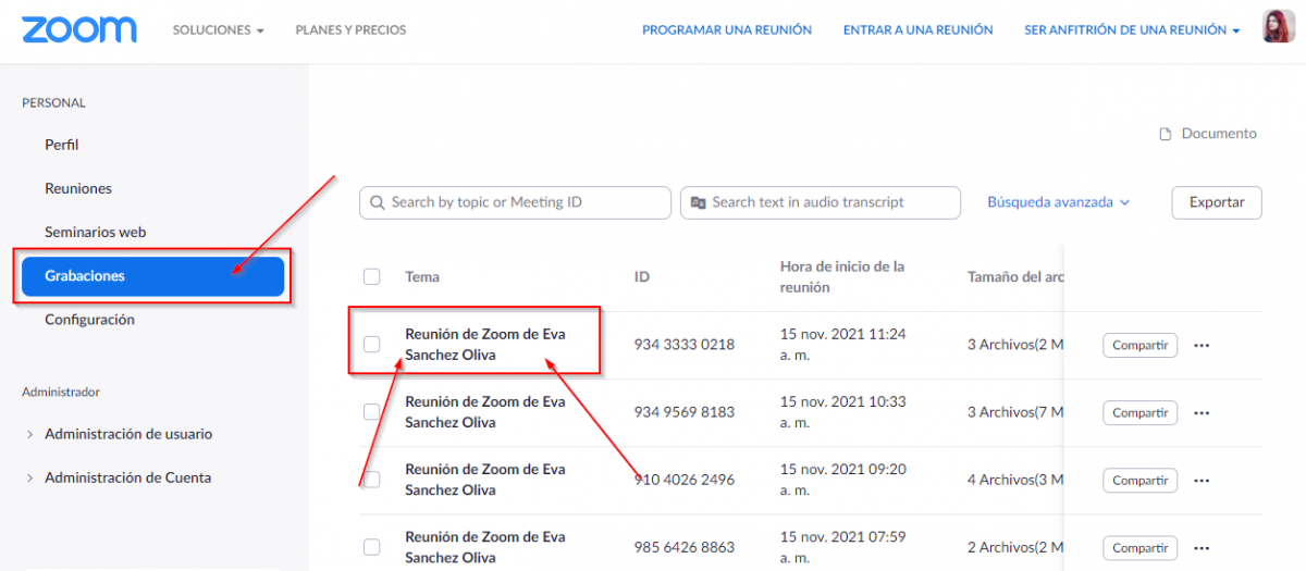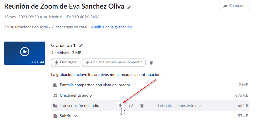 Enregistreu la reunió al núvol (aquí trobareu més informació sobre com fer-ho: Com gravar la pantalla i àudio d'una reunió de Zoom?) i descarregueu-vos el fitxer des del portal Zoom UB. Per fer-ho, només cal que feu clic a Enregistraments i feu clic al nom de la reunió de la qual voleu descarregar-vos el fitxer: