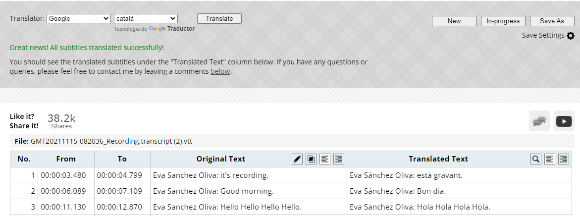 De forma automàtica, tot el text de la transcripció es traduirà a la llengua que heu triat. Nosaltres hem triat el català: