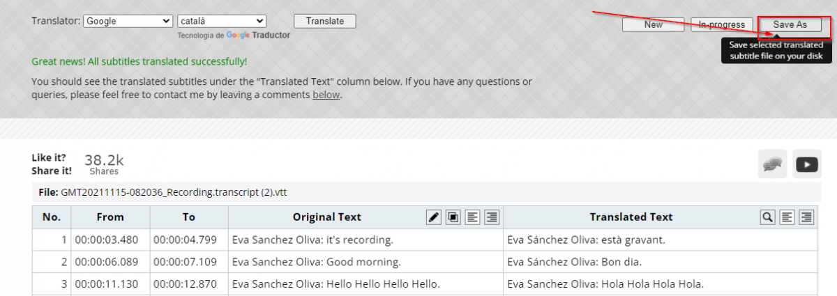 Seguidament, podeu desar el fitxer traduït al vostre ordinador, tot fent clic al botó Save As, situat a la cantonada superior dreta de la pantalla: