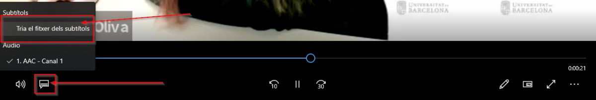 Finalment, només cal incloure el fitxer amb els subtítols al vostre vídeo. Per fer-ho, haureu d'haver-vos descarregat l'enregistrament des del portal de Zoom UB. La major part dels programaris que venen instal·lats per defecte als nostres ordinadors ja inclouen la possibilitat de carregar un fitxer amb subtítols al vídeo que estan reproduint.