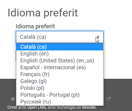 Idioma preferit: podreu triar quin és l'idioma en el qual se us mostrarà la plataforma. Podreu triar entre català, anglès, espanyol, francès, gallec, polonès, portuguès i rus: