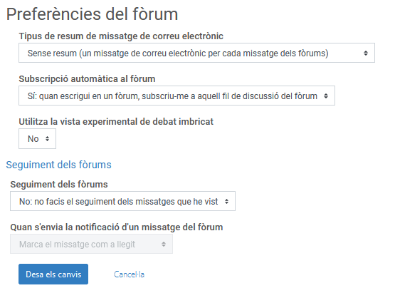 Preferències del fòrum: des d'aquí podreu configurar diferents paràmetres. D'una banda, el tipus de resum que rebreu al vostre correu electrònic en el moment de rebre notificacions sobre publicacions als fòrums. D'altra banda, podreu editar la subscripció automàtica del fòrum i com voleu fer el seguiment dels missatges als fòrums: