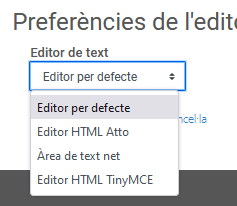Preferències de l'editor: des d'aquí podreu decidir quin editor de text voleu a tota la plataforma del Campus Virtual UB. Podreu escollir entre l'editor HTM Atto, àrea de text net o l'editor HTML TinyMCE: