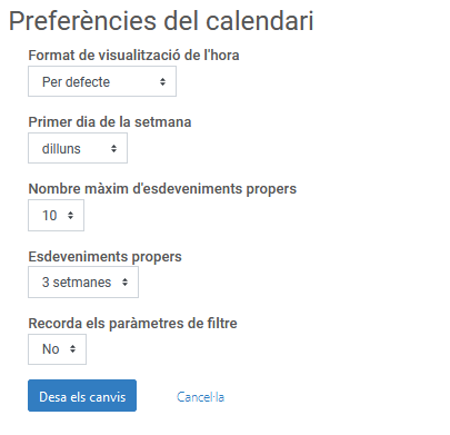 Preferències del calendari: aquests paràmetres us serviran per personalitzar el mòdul calendari que trobareu al tauler d'usuari: