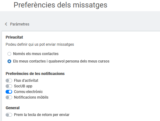 Preferències dels missatges: en aquest espai podreu definir la configuració de la missatgeria interna del Campus Virtual UB. Podreu escollir qui us pot enviar missatges (només els vostres contactes o qualsevol persona que estigui inscrita als vostres cursos), les preferències de les notificacions dels missatges (si les voleu rebre a les aplicacions del Campus Virtual, SocUB, correu electrònic...) i, finalment, si voleu prémer a la tecla de retorn per enviar els missatges: