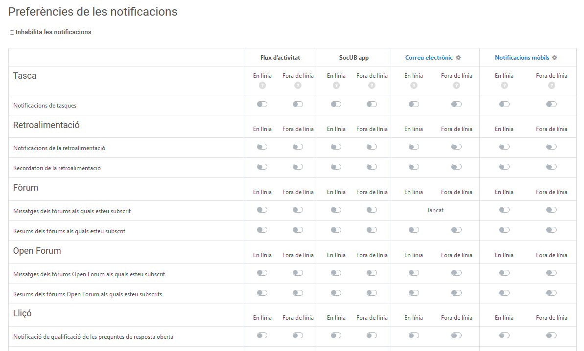 Preferències de les notificacions: des d'aquesta pàgina podreu decidir si voleu rebre notificacions de cadascuna de les activitats que trobareu al llistat. Podreu decidir si voleu rebre avisos al flux d'activitat, a l'aplicació de SocUB, al correu electrònic i notificacions mòbils, i a cadascuna d'aquestes opcions, podreu especificar si voleu rebre els avisos quan esteu en línia o fora de línia: