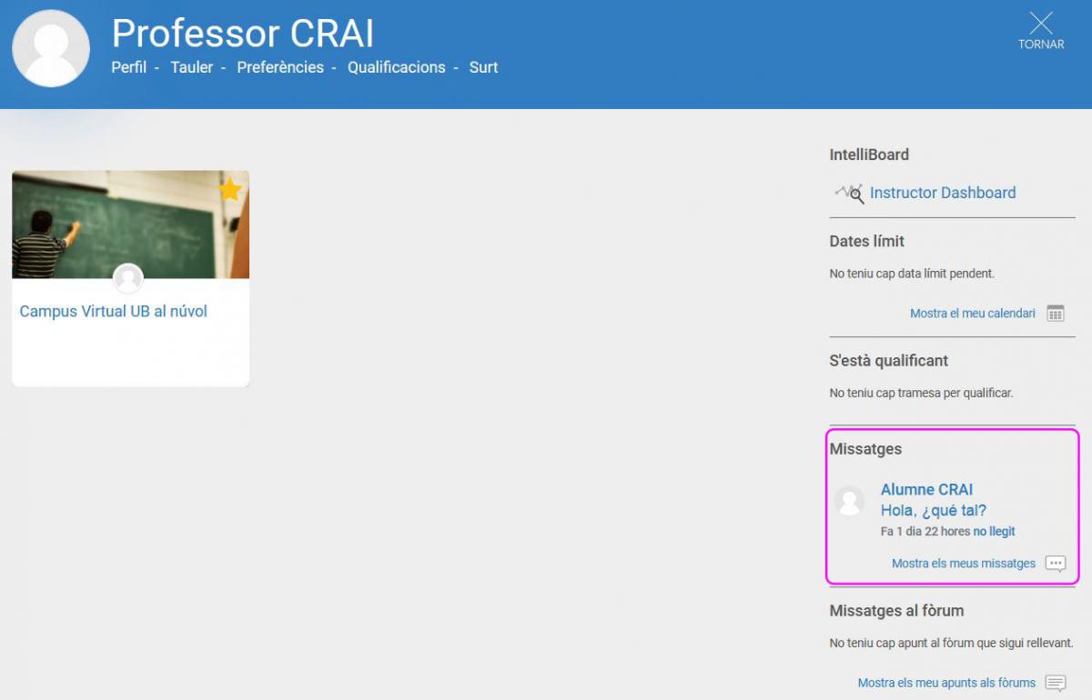 En entrar al Campus Virtual a la part dreta ens fixem en l'apartat Missatges. És aquí on apareixeran els missatges que ens poden enviar altres alumnes o professors. Premem ara sobre de Mostra els meus Missatges.