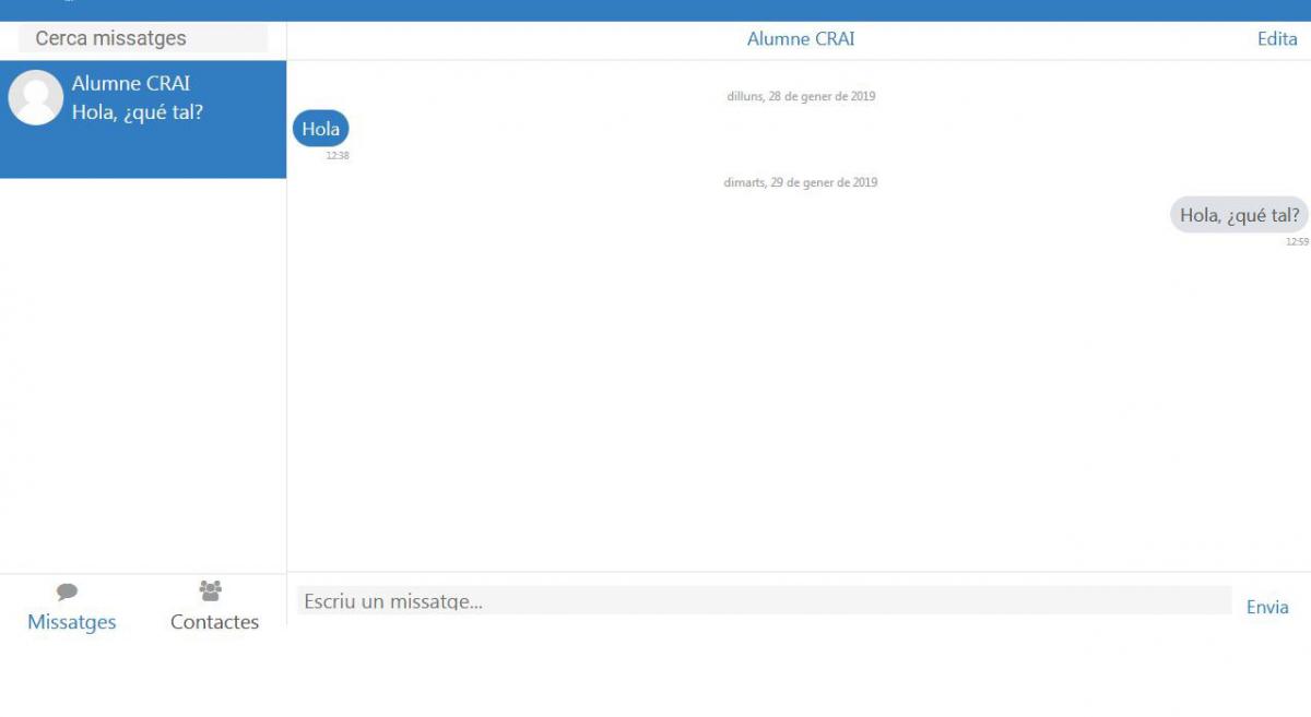 La missatgeria permet mantenir una comunicació escrita entre dos o més usuaris. Tots els missatges es registren i es poden revisar posteriorment.