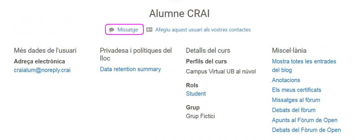Aquí ens surten tots els usuaris inscrits en un curs determinat. Seleccionem el compte de la persona a la qual volem enviar un missatge.