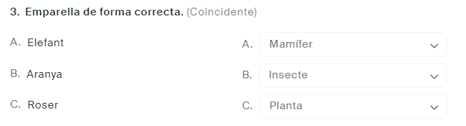 - Coincidente: els participants a l'enquesta poden emparellar les indicacions del costat esquerre amb les respostes del costat dret. L'ordre de les preguntes i les respostes es pot ajustar segons sigui necessari. Es poden proporcionar fins a 9 indicacions per a cada pregunta, amb les possibles coincidències que oscil·len entre 2 i 9 opcions.