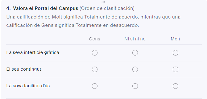 - Orden de clasificación: els participants a l'enquesta poden classificar cada element en funció de l'escala proporcionada. Es poden proporcionar fins a 10 ítems per a cada pregunta, amb l'escala que permet un rang de 2 a 7 opcions.