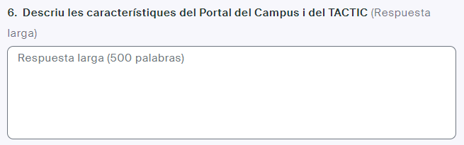 - Respuesta larga: els participants a l'enquesta poden respondre amb una resposta llarga. Es poden establir els caràcters mínims i màxims permesos per a la resposta.