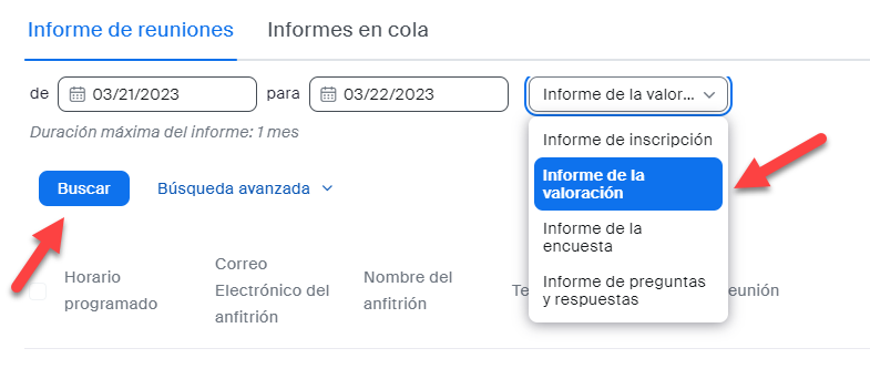 - A la següent pantalla haurem de seleccionar les dates entre les quals va tenir lloc la reunió on vam llençar la votació/qüestionari i el tipus d'informe, en aquest cas "Informe de la Valoración" i fer clic a Buscar